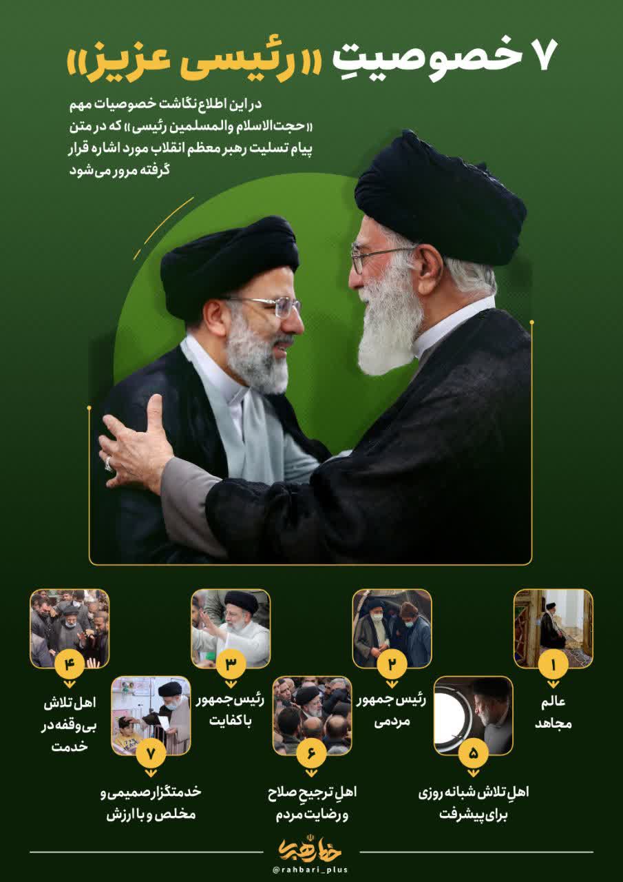 ▪️رئیسی عزیز خستگی نمیشناخت. در این حادثهی تلخ، ملت ایران، خدمتگزار صمیمی و مخلص و با ارزشی را از دست داد. برای او صلاح و رضایت مردم که حاکی از رضایت الهی است بر همه چیز ترجیح داشت، از این رو آزردگیهایش از ناسپاسی و طعن برخی بدخواهان، مانع تلاش شبانه روزیش برای پیشرفت و اصلاح امور نمیشد.